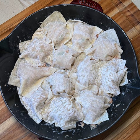You mix everything right in the pan, form the filling, press a wrapper on top, and let it cook in stages until the bottoms get crispy and the centers stay juicy. It’s not the prettiest process, but it works.