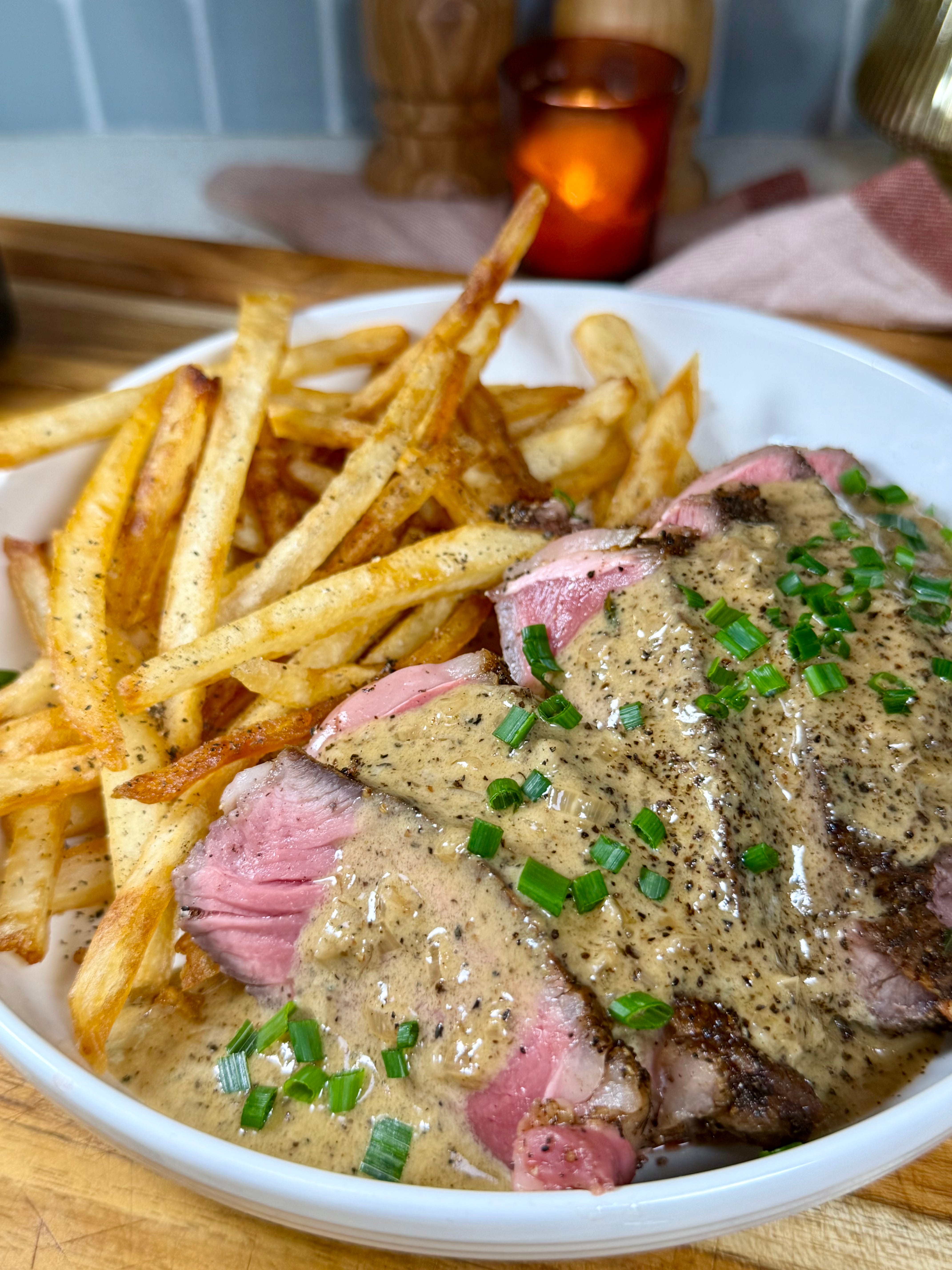 Welcome to Dinner for Two, Episode Two. I recently got back from eating my way through Normandy, so it felt only right to recreate one of the most iconic French bistro dishes at home: Steak au Poivre Frites.