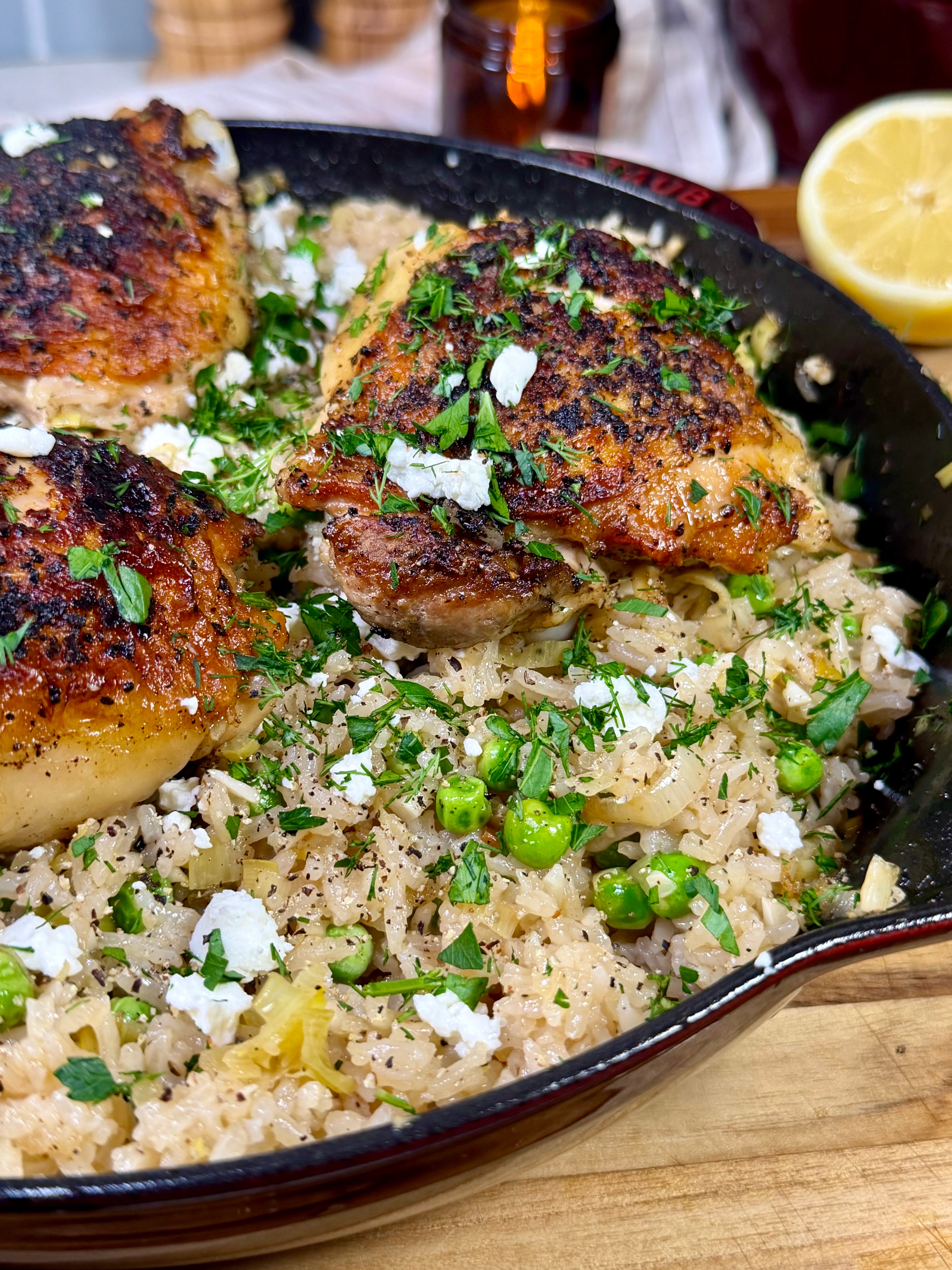 This time of year is still perfect for cozy meals, but ones that feel a little fresher and brighter. This one-pan spring chicken and rice hits that sweet spot perfectly. Golden, crispy chicken thighs roast right on top of lemony rice with sauteed leeks, and everything gets finished with fresh dill, parsley, sweet peas, and one of my all-time favorite cheeses… goat cheese. It’s simple, incredibly delicious, and comes together in one skillet.