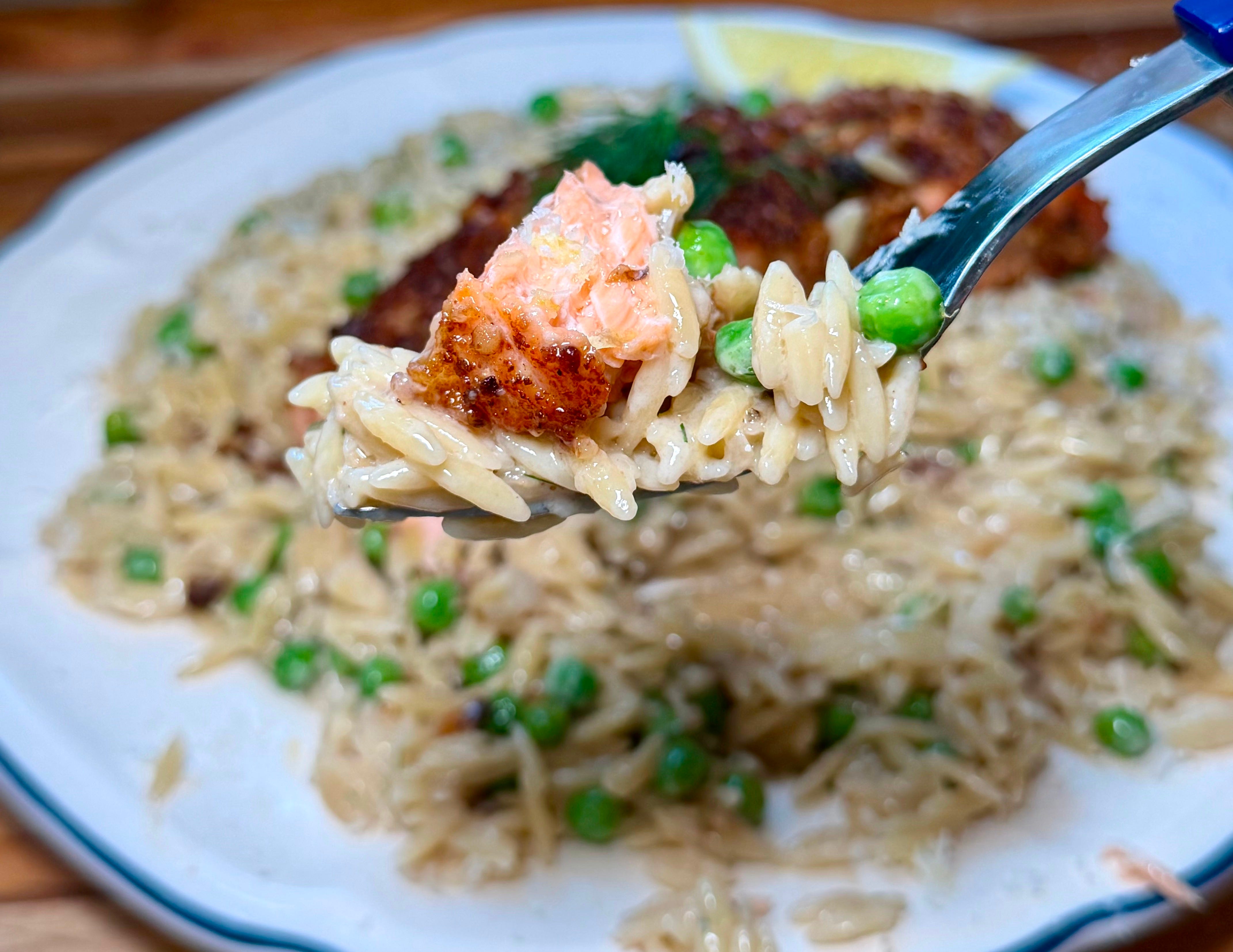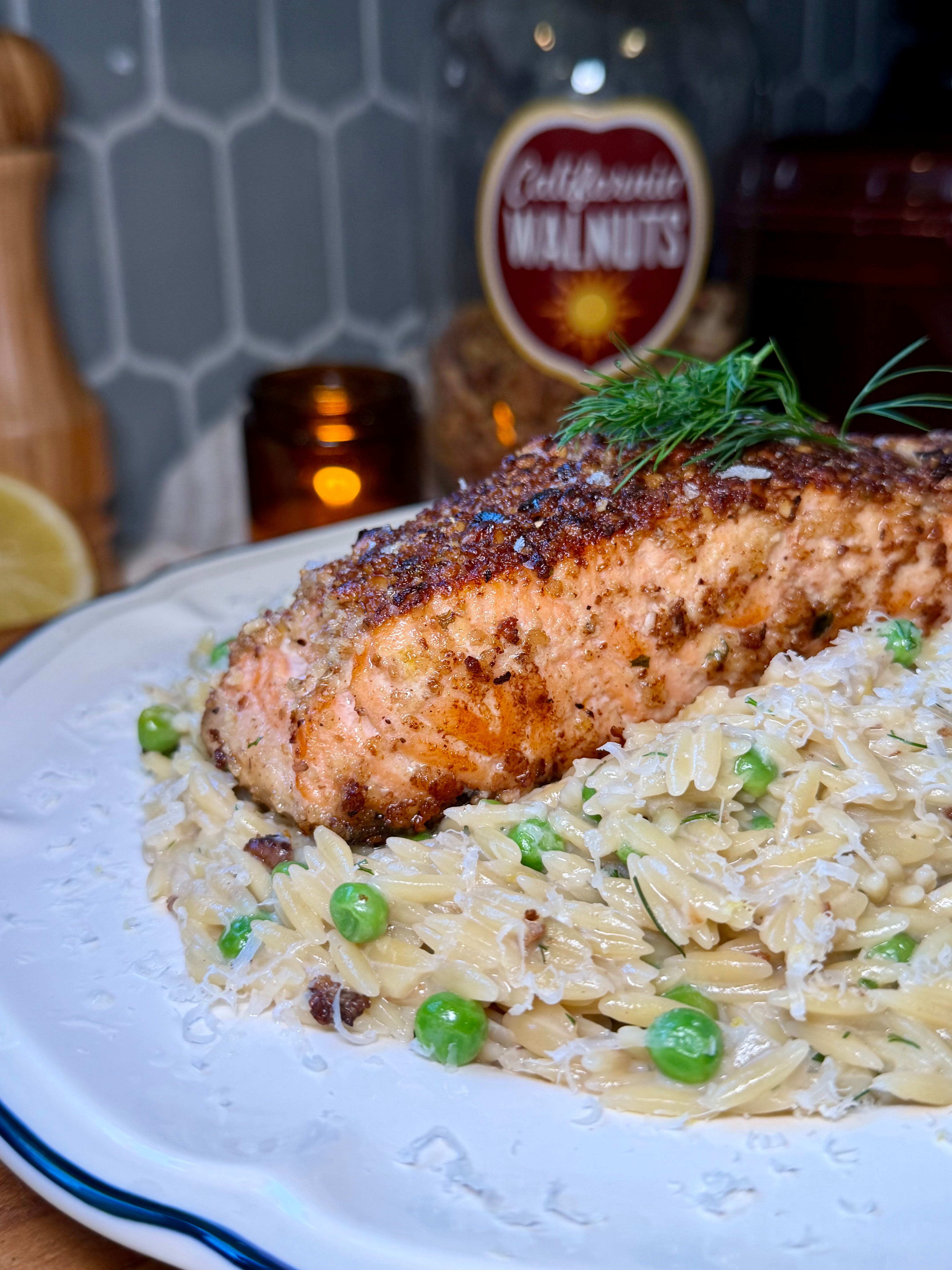 For tonight’s Sunday supper, I wanted to lean into spring without letting go of coziness, and this does exactly that. You get the crispy walnut crust on the salmon, the creamy lemony orzo underneath, and just enough brightness from the peas (use snap peas if you can find them) and fresh herbs to keep it from feeling heavy.
