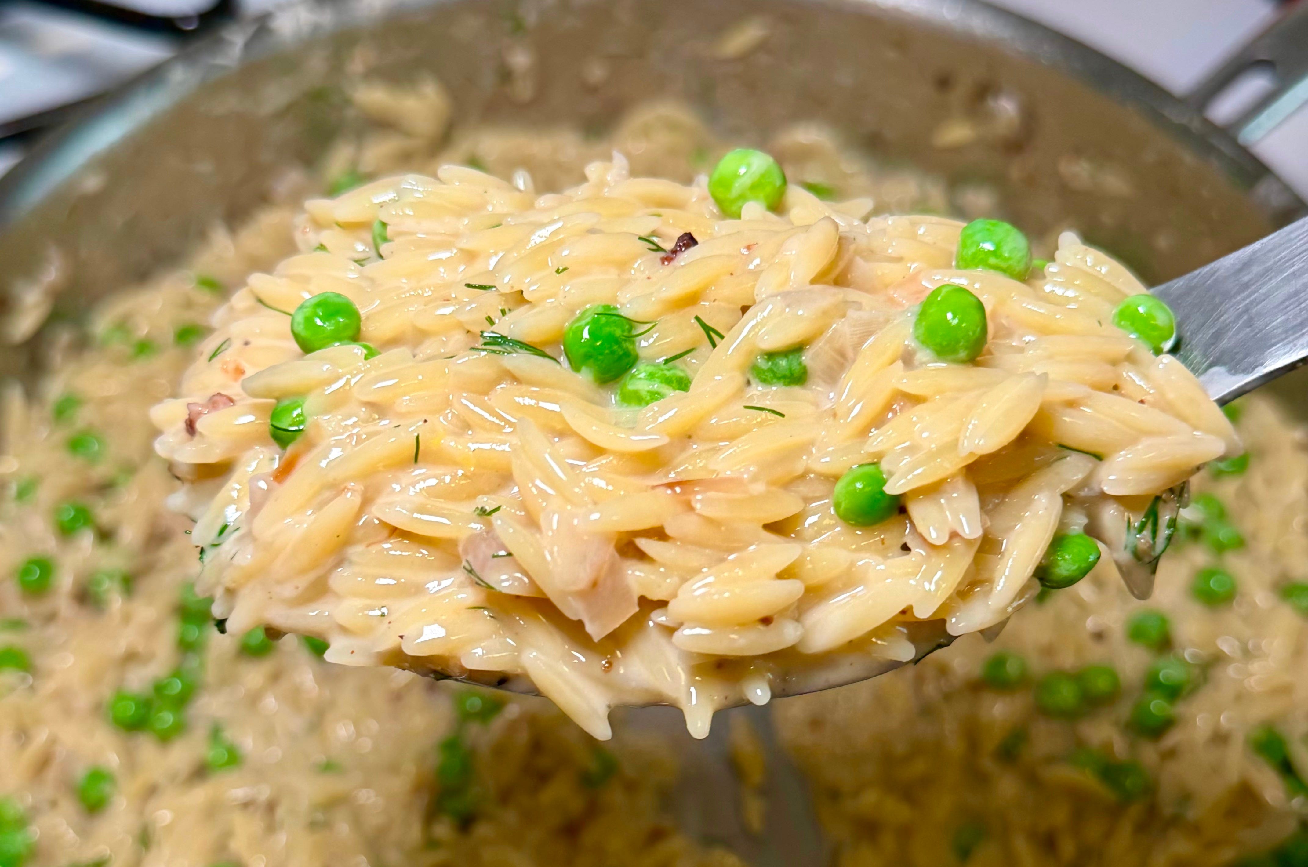 Toast the orzo before adding liquid . Let the orzo cook in the pan for about a minute before adding wine and broth. It adds a subtle nuttiness and helps the texture stay creamy, not mushy.